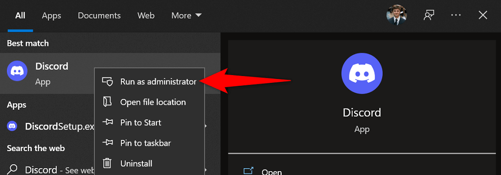 - Right-click Discord and choose Run as administrator.
