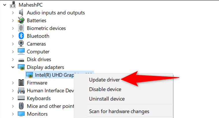 - Expand Display adapters, right-click your graphics card, and choose Update driver.