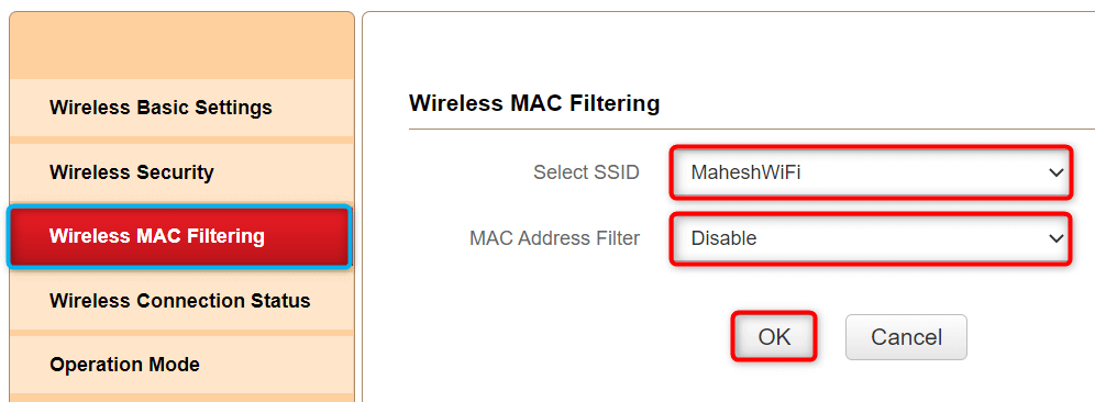 - Select your Wi-Fi network in the Select SSID field, choose Disable in the MAC Address Filter menu, and select OK.