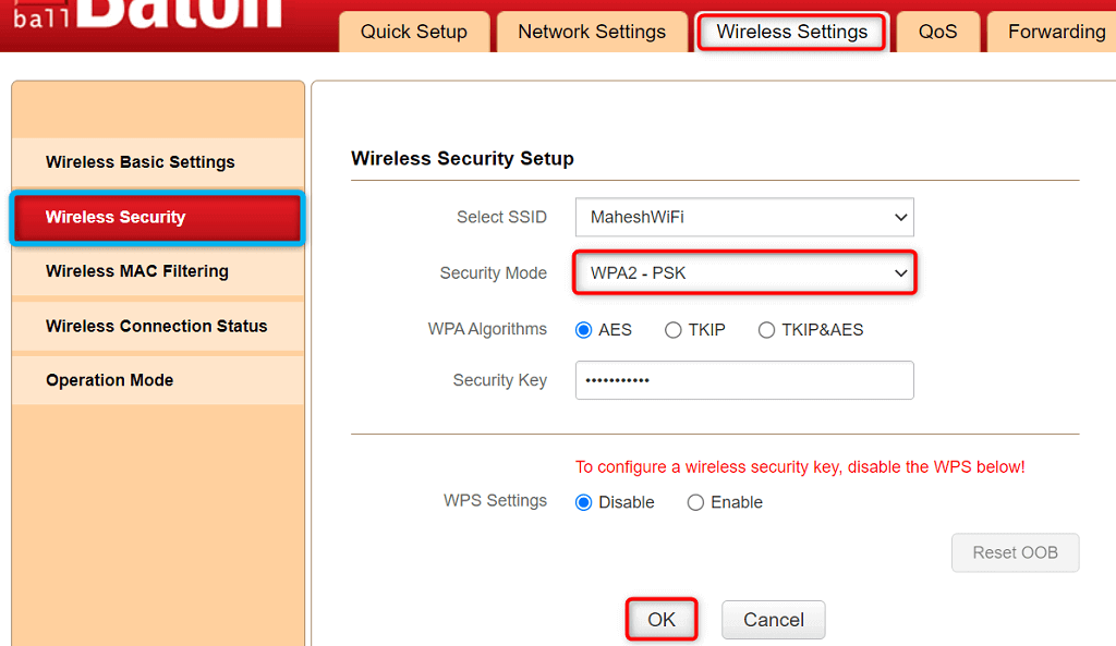 - Choose Wireless Security from the sidebar on the left.