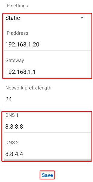 - Expand the **Advanced options** menu and choose **Static** from the **IP settings** menu. * Enter **192.168.1.20** in the **IP address** field, **192.168.1.1** (your router’s IP address) in the **Gateway** field, **8.8.8.8** in the **DNS 1** field, and **8.8.4.4** in the **DNS 2** field. Then, tap **Save** to save your settings.