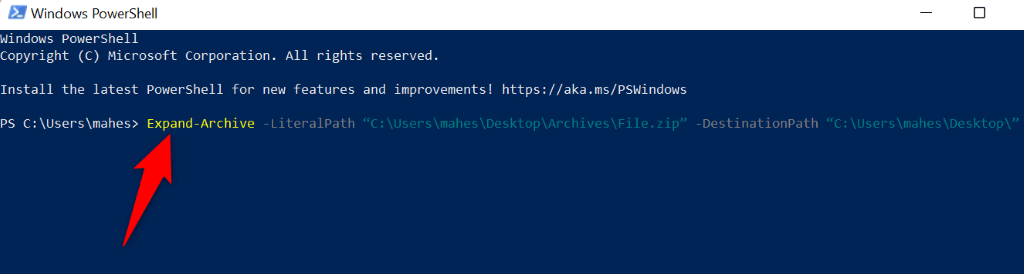 - Type the following command in PowerShell and press Enter. Here, replace SourcePath with the path to your ZIP file and TargetPath with the path where you want to extract your archive. Expand-Archive -LiteralPath “SourcePath” -DestinationPath “TargetPath”