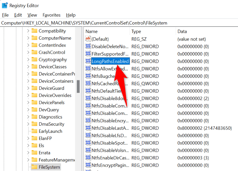 - Open the LongPathsEnabled entry located on the right.