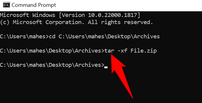 - Then, run the following command replacing FileName.zip with the name of your ZIP file. tar -xf FileName.zip