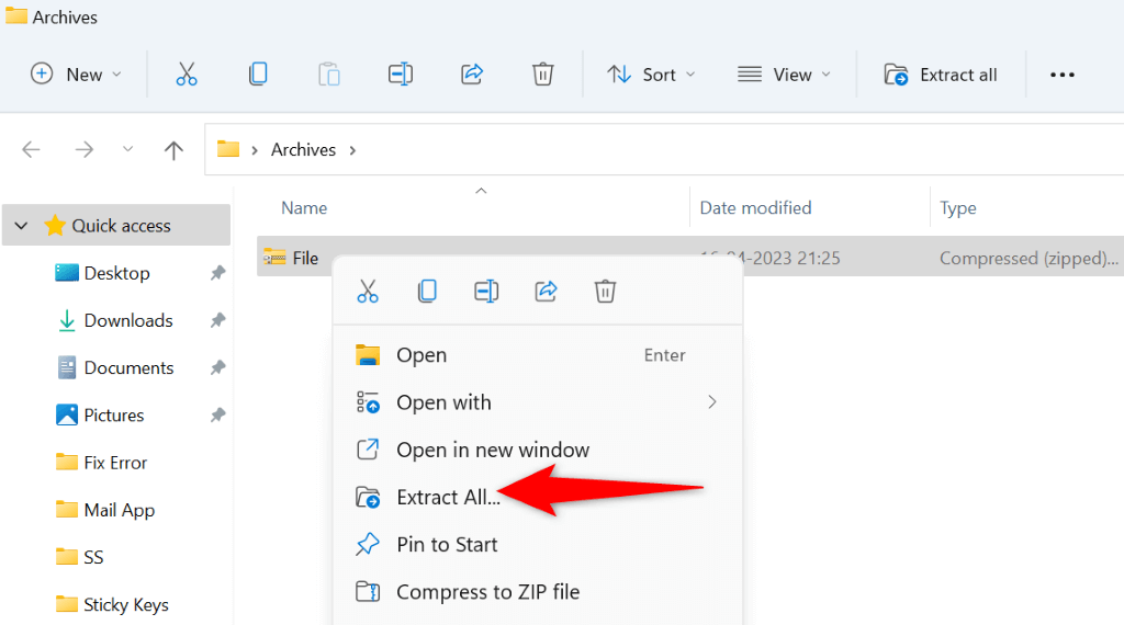 - Extract your ZIP’s contents by right-clicking the archive, selecting Extract All, and choosing Extract.