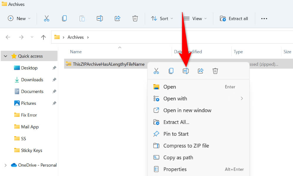 The easiest way to fix Windows’ “Path Too Long” error is by renaming your ZIP file. If your ZIP file has a lengthy name, shortening the name will allow you to bypass the above error.