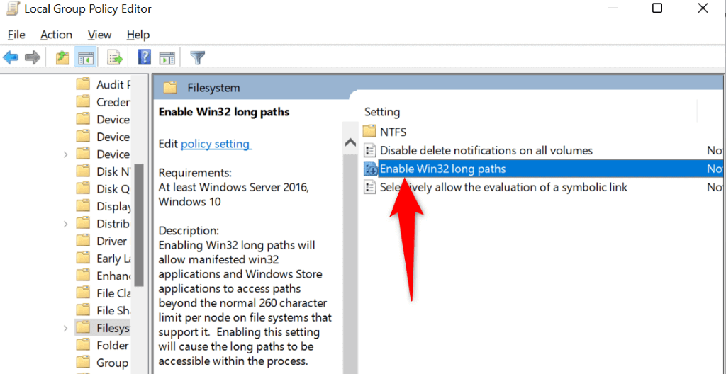 - Open the Run box using Windows + R. * Type the following in the box and press Enter: gpedit.msc * Navigate to Computer Configuration > Administrative Templates > System > Filesystem using the left sidebar. * Open the Enable Win32 long paths entry given on the right.