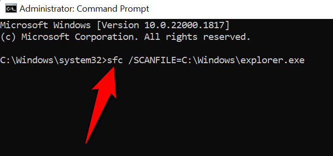 - Type the following command on the CMD window and press Enter: sfc /SCANFILE=C:\Windows\explorer.exe