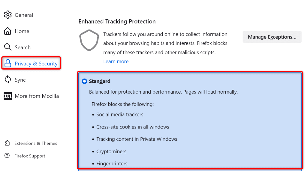 - Open Firefox, select the three horizontal lines in the top-right corner, and choose Settings. * Select Privacy & Security on the left. * Choose Standard under Enhanced Tracking Protection on the right.