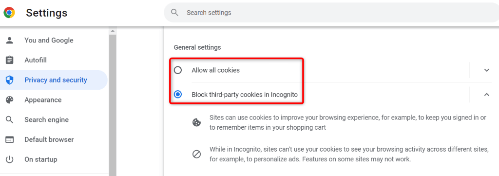 - Choose Allow all cookies or Block third-party cookies in Incognito.