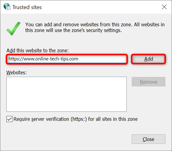 - Access the Security tab, select Trusted sites, and choose Sites.
