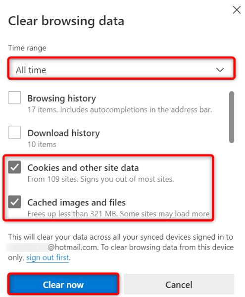 - Open Edge, enter the following in the address bar, and press Enter: edge://settings/clearBrowserData * Choose All time from the Time range drop-down menu. * Select the Cookies and other site data and Cached images and files options.