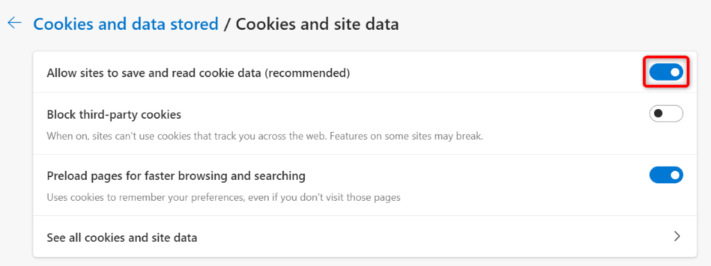 - Launch Edge, select the three dots in the top-right corner, and choose Settings. * Select Cookies and site permissions on the left. * Choose Manage and delete cookies and site data on the right. * Enable the Allow sites to save and read cookie data (recommended) option.