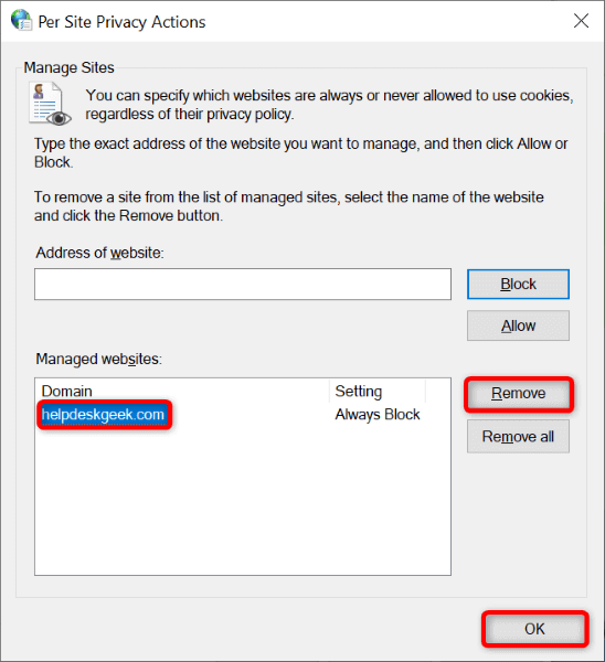 Your Windows PC keeps a list of sites that can’t place cookies in your web browsers. You should check this list and ensure the site you’re trying to access isn’t listed here.