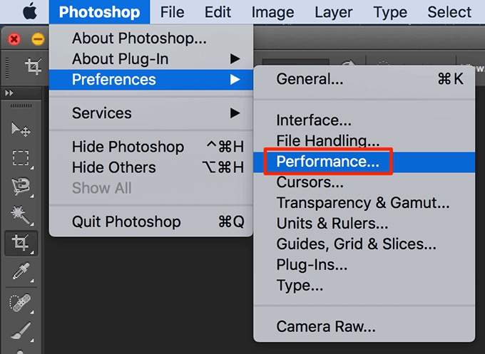 - Click the Photoshop option at the top, select Preferences, and choose Performance.