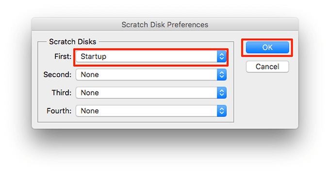 - Select a new scratch disk from the **Startup** dropdown menu and click **OK**.