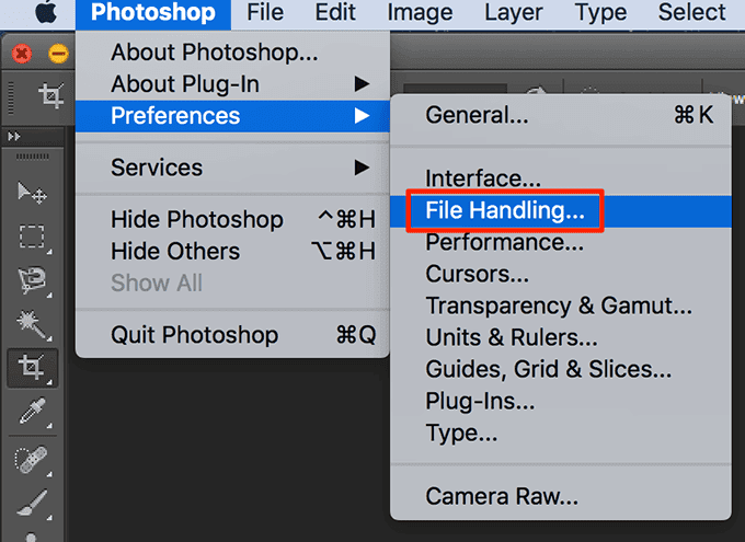 - Click **Photoshop** at the top, select **Preferences**, and choose **File Handling**.