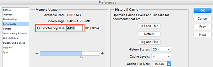 - On the right-hand side pane, you’ll see a box labeled as **Let Photoshop Use**. In the box next to this option, enter the amount of RAM that you want for Photoshop to use. Then click **OK**.