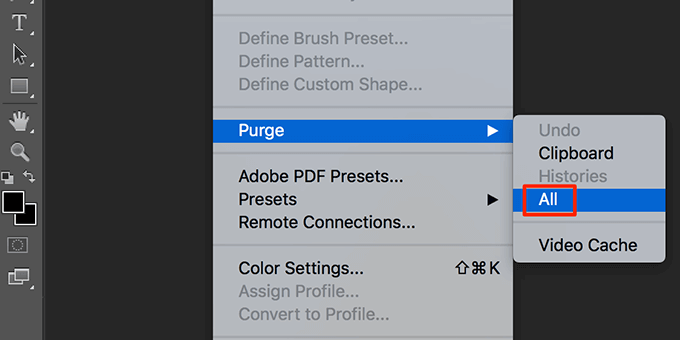 - Click the Edit menu at the top, select Purge, and choose All. This’ll delete all the Photoshop cache files.