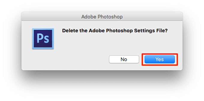 - You’ll get a prompt asking if you want to delete the Photoshop settings file. Click **Yes** to delete the files.