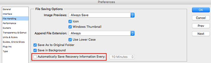 Photoshop automatically saves your files as you work on them but this increases the amount of memory it uses on your computer. If auto-recovery saving isn’t much use to you, you can disable it to save some space on your scratch disks.