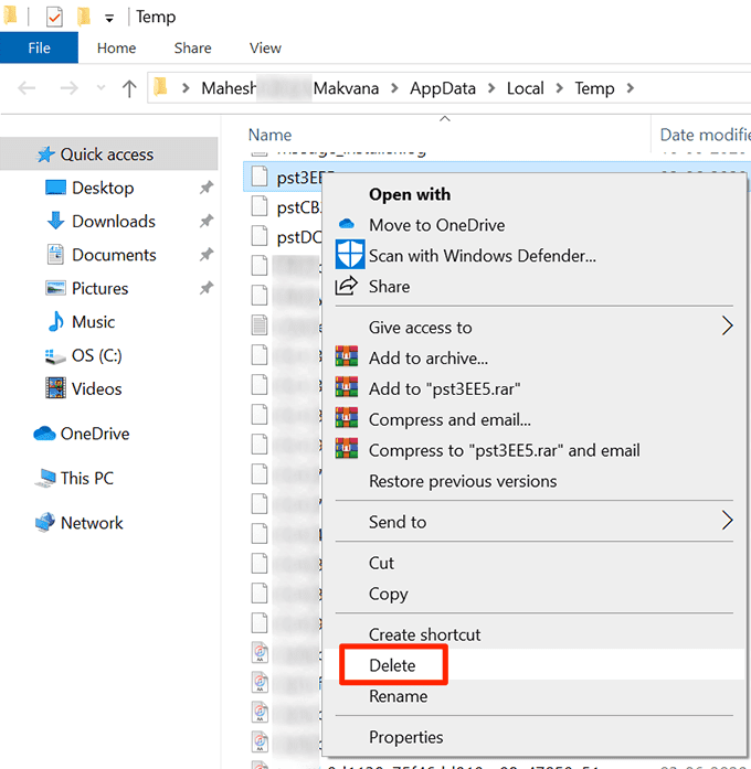- When the temporary folder opens, find the files named **Photoshop** or **PST**. * Right-click those files and select **Delete**.