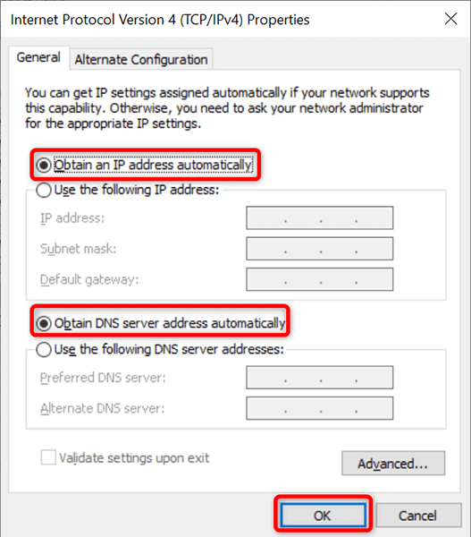 - Enable both **Obtain an IP address automatically** and **Obtain DNS server address automatically** options. Then, select **OK** at the bottom.