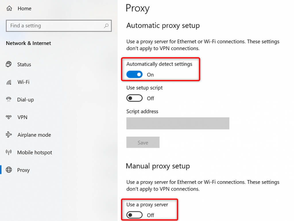 - Turn off the **Use a proxy server** option to temporarily disable the proxy. * Open **Chrome** and see if you can access your sites.