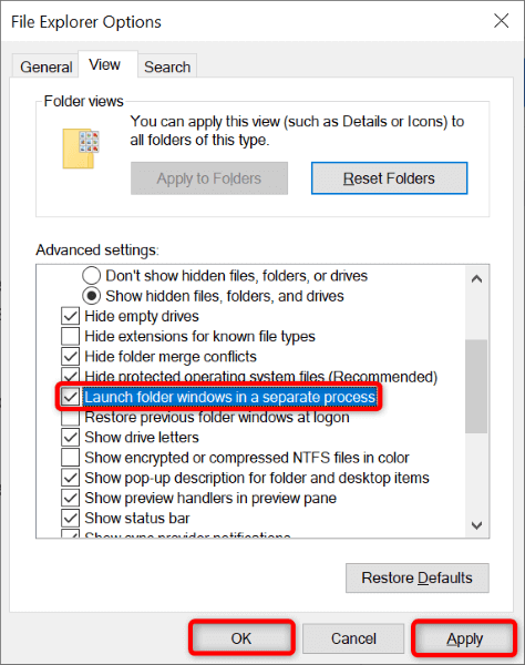 By default, File Explorer launches your folder windows in a single process. It’s a good idea to isolate your folder windows’ processes so that one entity’s issues don’t affect others.