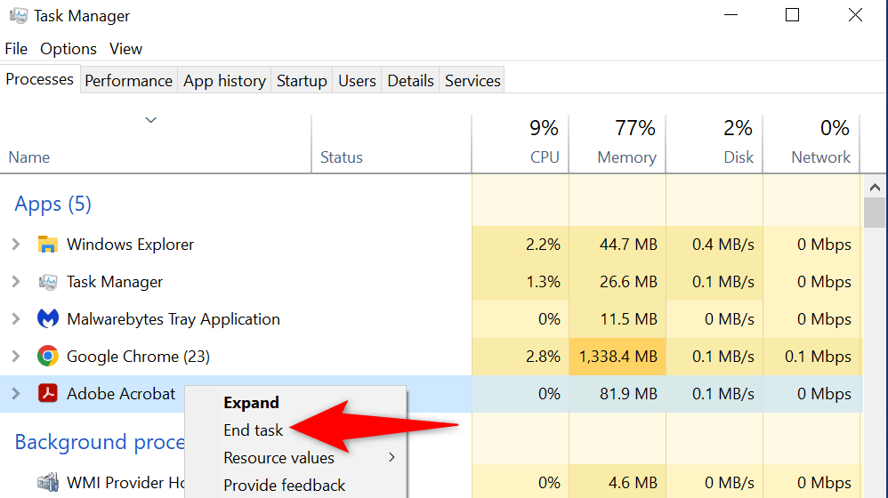 - Right-click the app that’s using your file and choose End task. This performs an “end process” task, killing the selected process.