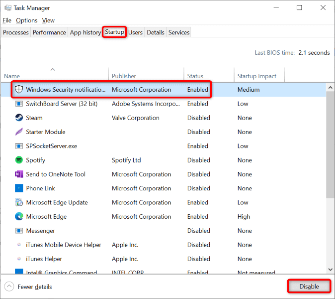 - Access the Startup tab and choose Open Task Manager. * Select each Enabled item on the list and choose Disable at the bottom. Then, close Task Manager.