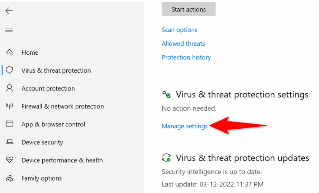 - Select Manage settings in the Virus & threat protection settings section.