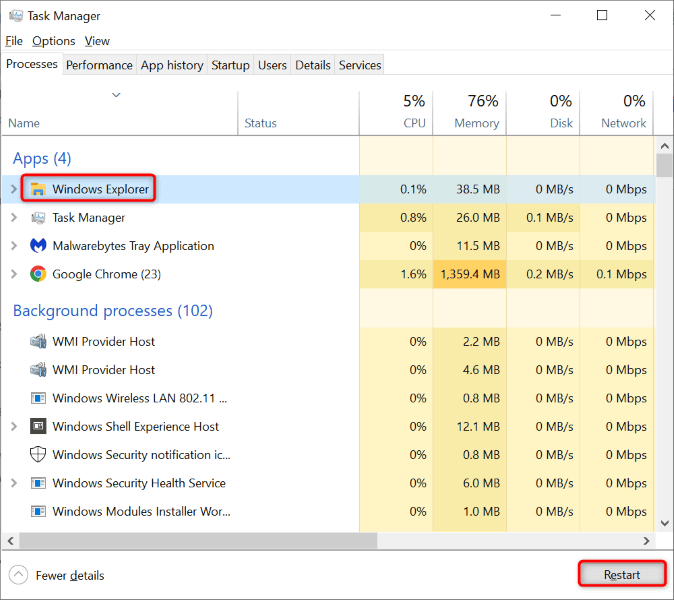 - Choose Windows Explorer on the list and select Restart in the bottom-right corner.