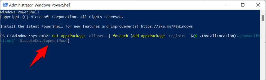 - Enter the following in your PowerShell window and press Enter: Get-AppxPackage -allusers | foreach {Add-AppxPackage -register “$($_.InstallLocation)\appxmanifest.xml” -DisableDevelopmentMode}