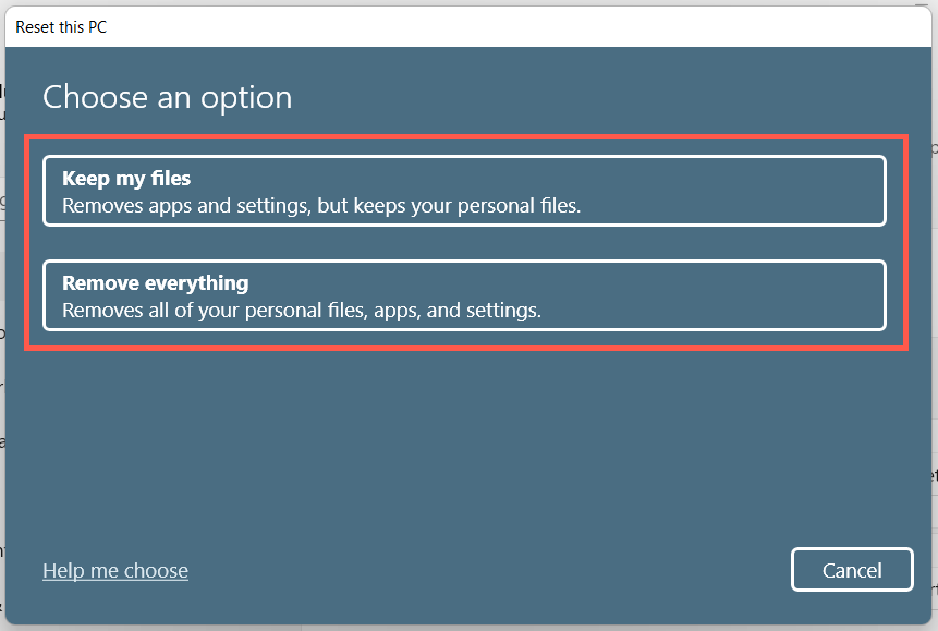 - Select Keep my files to keep save personal data during the restore procedure. Or, choose Remove everything for a total factory reset.