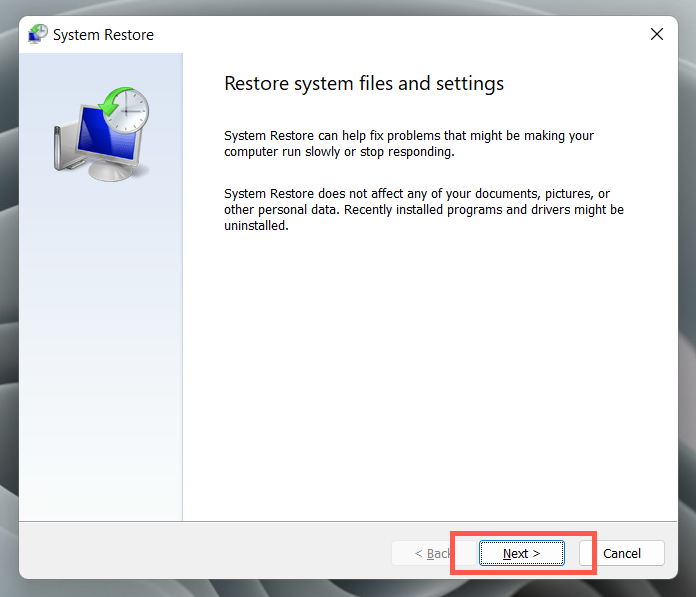 - Select Next on the System Restore pop-up window.