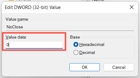 - Double-click the NoClose registry entry on the right pane.