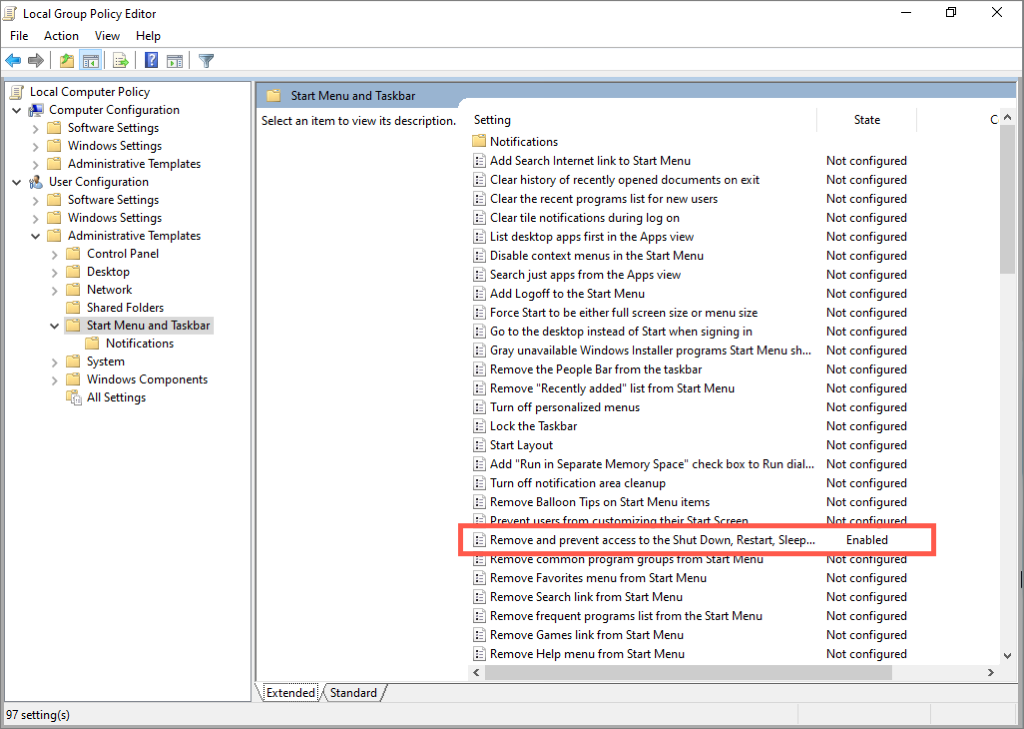 - Go to User Configuration > Administrative Templates > Start Menu and Taskbar on the left navigation area. * Double-click the Remove and prevent access to the Shut Down, Restart, Sleep, and Hibernate commands policy setting on the right pane.