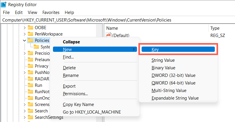 - Right-click the Policies folder on the left pane and select New > Key.