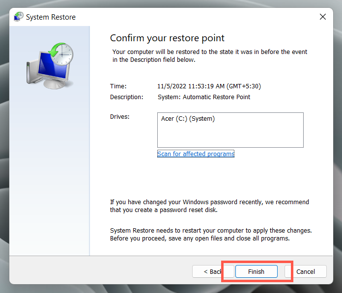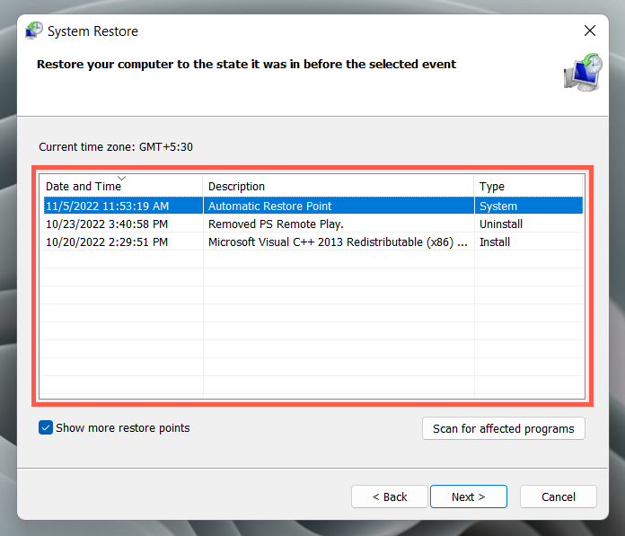- Check the box next to Show more restore points and pick a restore point. Select Scan for affected programs if you want to check what programs might be impacted if you revert the system to the selected time frame.