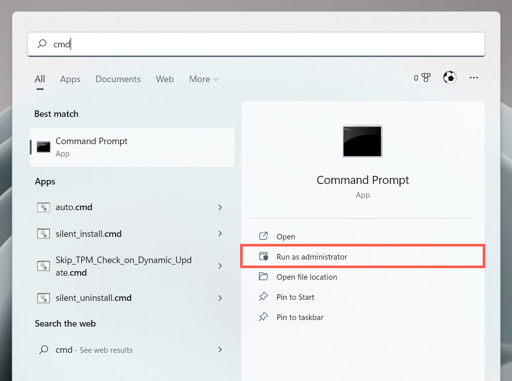 - Open the Start menu, type cmd into the search bar, and select Run as administrator.