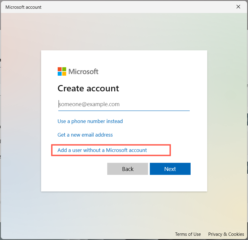 - Choose Add a user without a Microsoft Account.