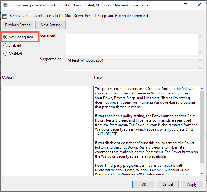 - Select the radio button next to Not Configured or Disabled.