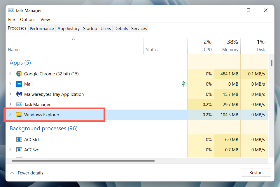 - Press Ctrl + Alt + Esc to open the Windows Task Manager. * Select Windows Explorer under the Processes tab.
