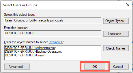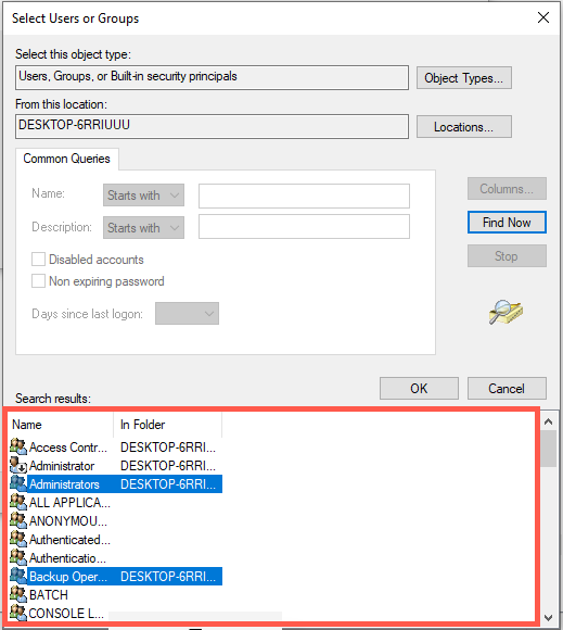 - Hold down the Ctrl key and select Administrators, Backup Operators, and Users from the list under Search results. Then, select Find Now.