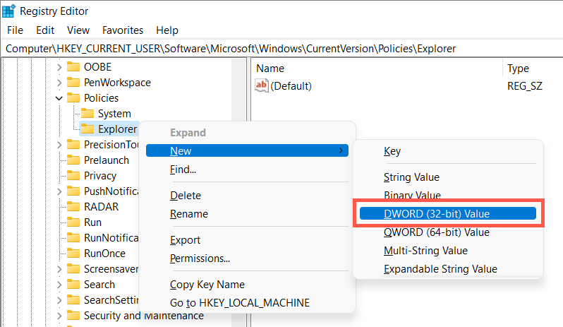- Right-click the Explorer folder and select New > DWORD (32-BIT).
