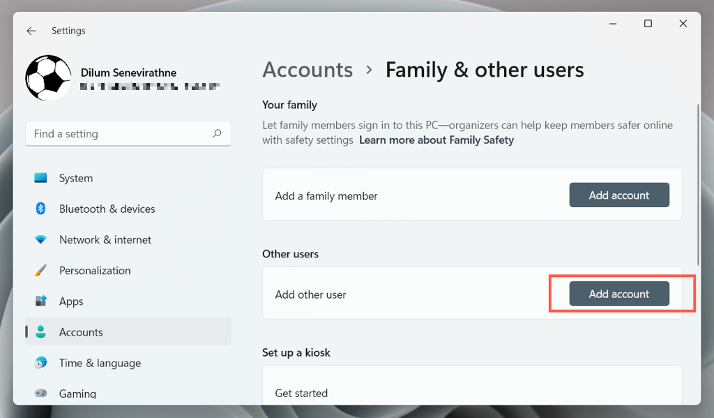 - Scroll down to Other users and select Add account.