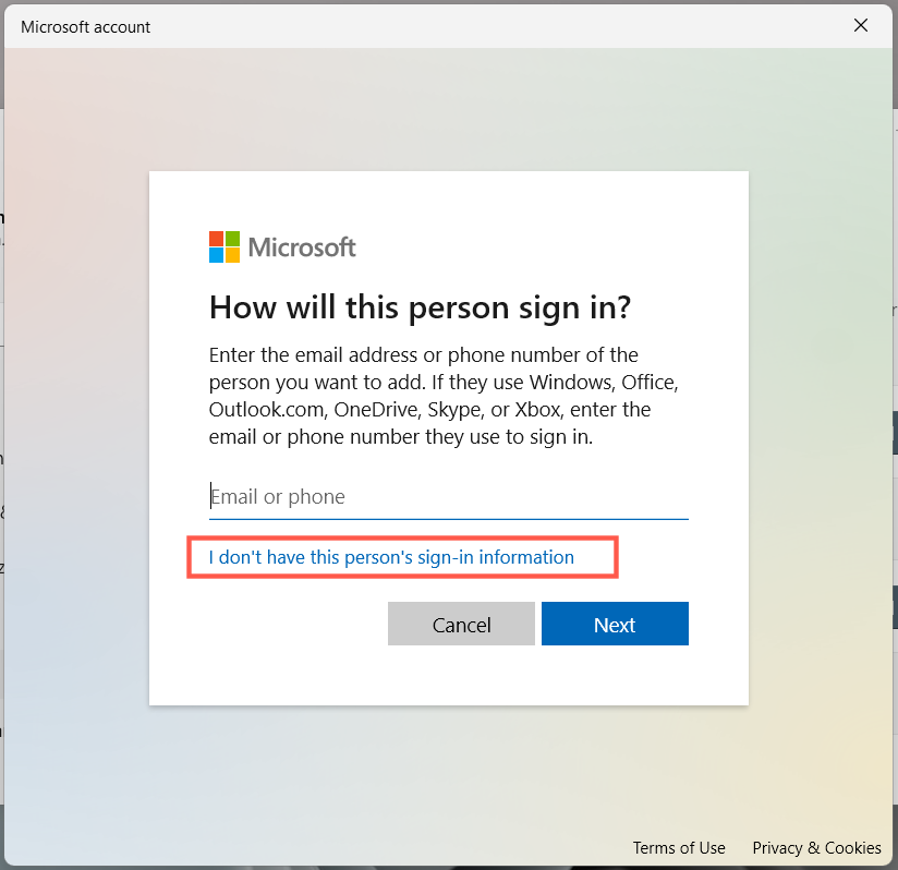 - Select I don’t have this person’s sign-in information.