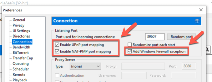 If your network router has automatic port forwarding options like UPnP (Universal Plug and Play) and NAT PMP (Network Port Mapping Protocol) available, uTorrent can take advantage of these to forward bypass firewall restrictions and connect your PC to torrent seeders and downloaders automatically. * You can check this setting is active by opening the uTorrent client and pressing Options > Preferences, then making sure the Enable UPnP port mapping and Enable NAT-PMP port mapping options are enabled. You should also ensure that the **Enable Windows Firewall exception **checkbox is enabled to allow uTorrent connections through your Windows firewall.