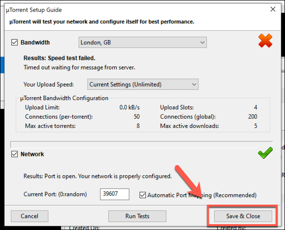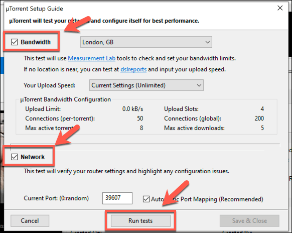 - The uTorrent setup guide will run. Once it has completed, the results of your tests will be listed under each section. Press Save and Close to save any recommended changes to your configuration.